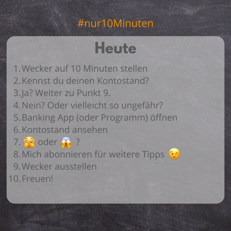 Wichtig ist nur, dass du dranbleibst. 10 Minuten –mindestens einmal in der Woche- solltest du in deine Finanzen/deinen „Verwaltungskram“ investieren.