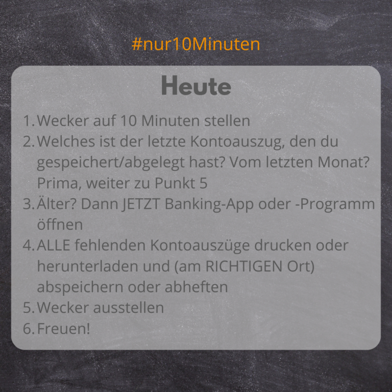 Wichtig ist nur, dass du dranbleibst. 10 Minuten –mindestens einmal in der Woche- solltest du in deine Finanzen/deinen „Verwaltungskram“ investieren.