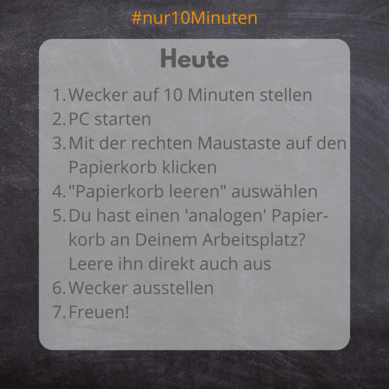 Wie wäre es, wenn du mit nur 10 Minuten (täglich, wenn du magst?!) viel mehr Ordnung und Struktur in deine Buchhaltung und dein Backoffice bringen könntest anstatt jedes mal Stunden damit zu verbringen? Oft macht es nämlich Sinn, größere (unangenehme) Aufgaben in mehrere „Häppchen“ aufzuteilen. Deshalb zeige ich dir in meiner „Nur 10 Minuten“-Reihe, welche kleinen Routinen dir dabei helfen können, deine Buchhaltung (und dein gesamtes Backoffice) aufzumöbeln. Okay, manches dauert vielleicht ein wenig länger als 10 Minuten (vor allem wenn du Dinge schon länger aufgeschoben hast), aber im Schnitt werden es nie mehr als 10 Minuten. Versprochen!